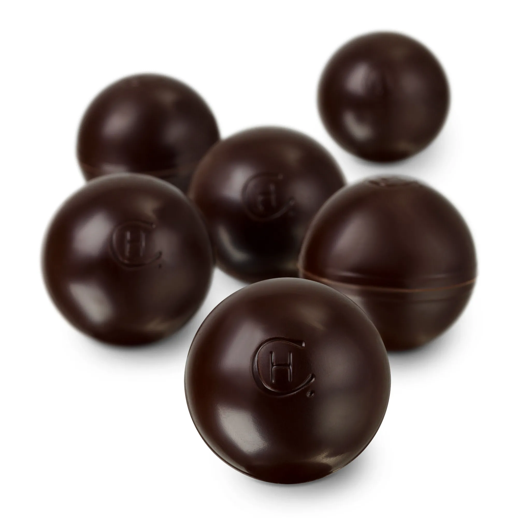 Our 85% cocoa dark chocolate has deep chocolatey notes and we knew these would shine through as a whipped cream ganache. Our 70% cocoa dark chocolate shell is deep and intense – and just perfect for those who prefer their chocolate on the less-sweet side. The shiny, spherical casing gives a satisfying crack to release the velvety ganache; the contrasting textures are a delight for the senses.