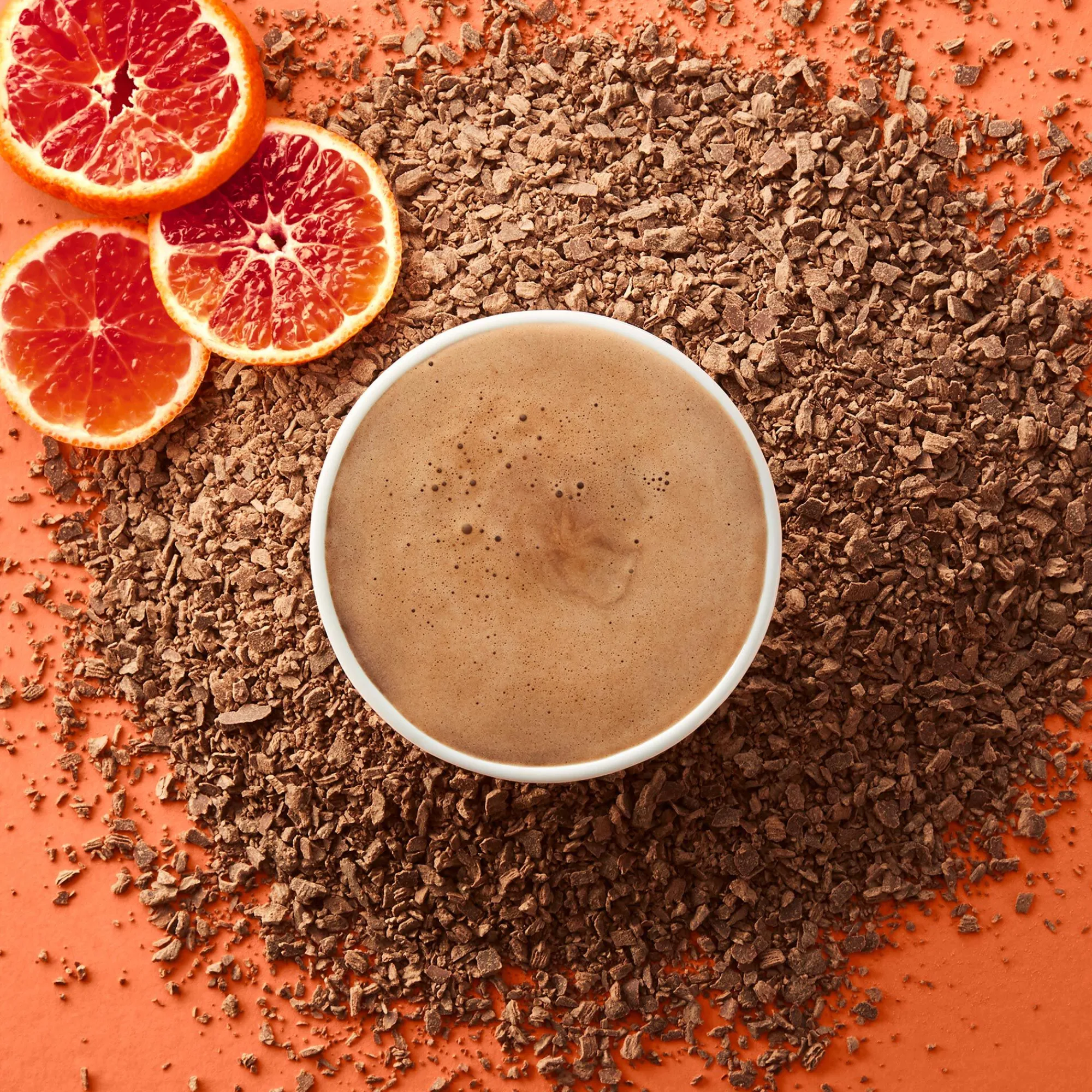 For our Orange hot chocolate, we reached for Supermilk, our 65% cacao chocolate that brings together the best of both chocolate worlds: all the creaminess of milk, all the depth of dark. For the zing, we selected blood orange – its zesty profile and subtle raspberry notes bring a distinctive citrus kick.
