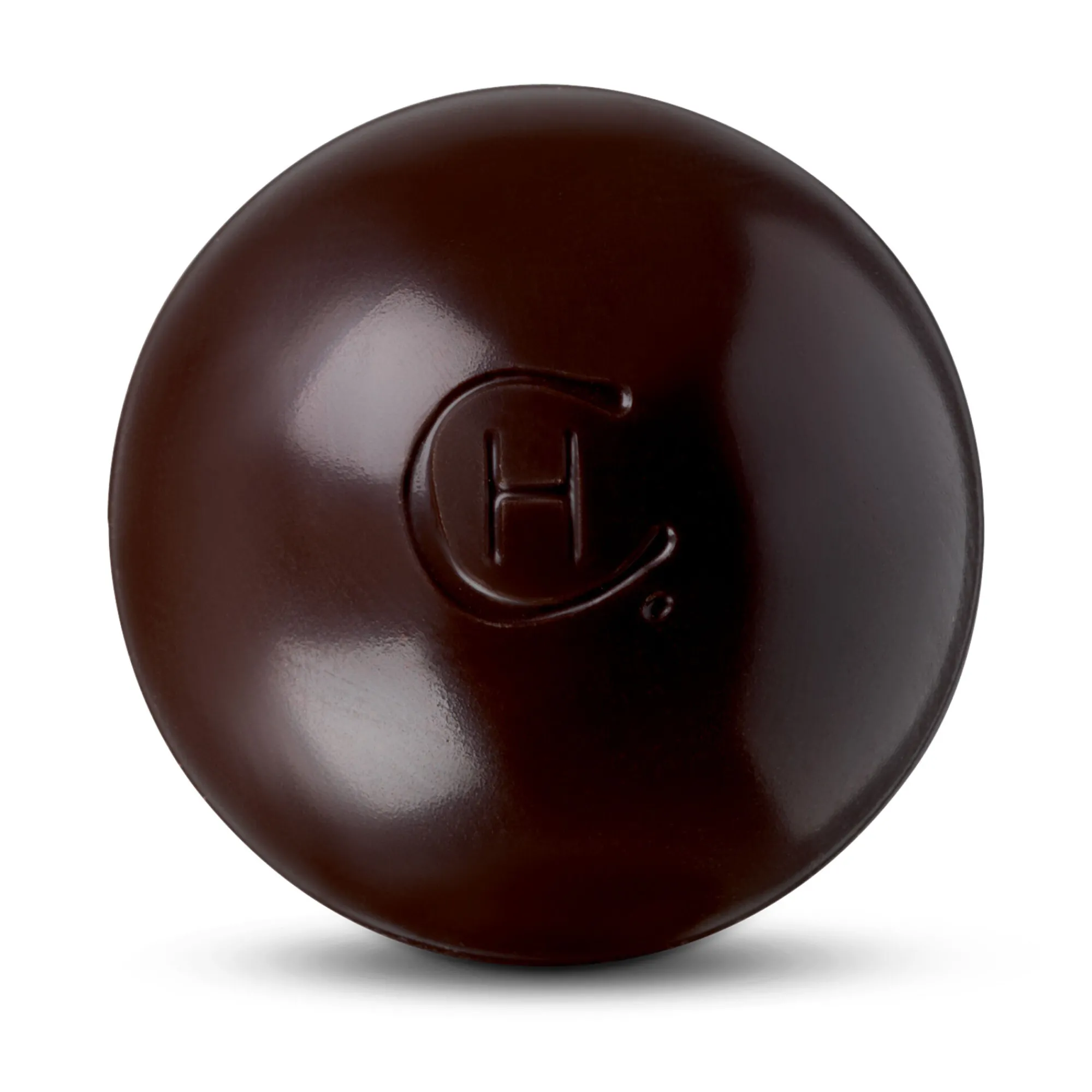 Our 85% cocoa dark chocolate has deep chocolatey notes and we knew these would shine through as a whipped cream ganache. Our 70% cocoa dark chocolate shell is deep and intense – and just perfect for those who prefer their chocolate on the less-sweet side. The shiny, spherical casing gives a satisfying crack to release the velvety ganache; the contrasting textures are a delight for the senses.