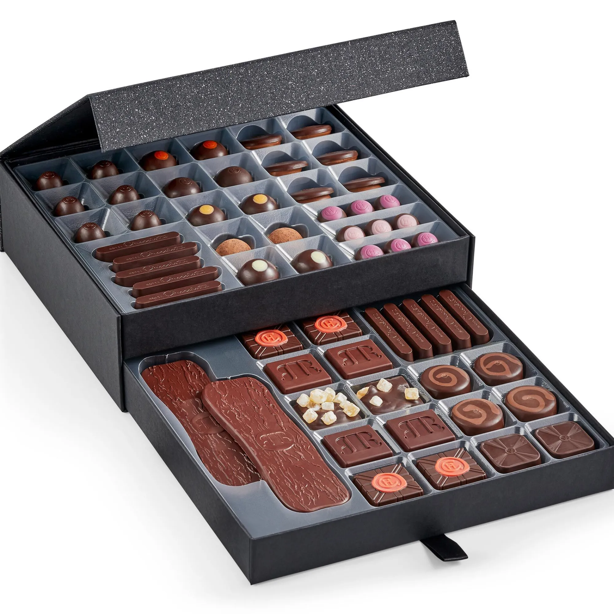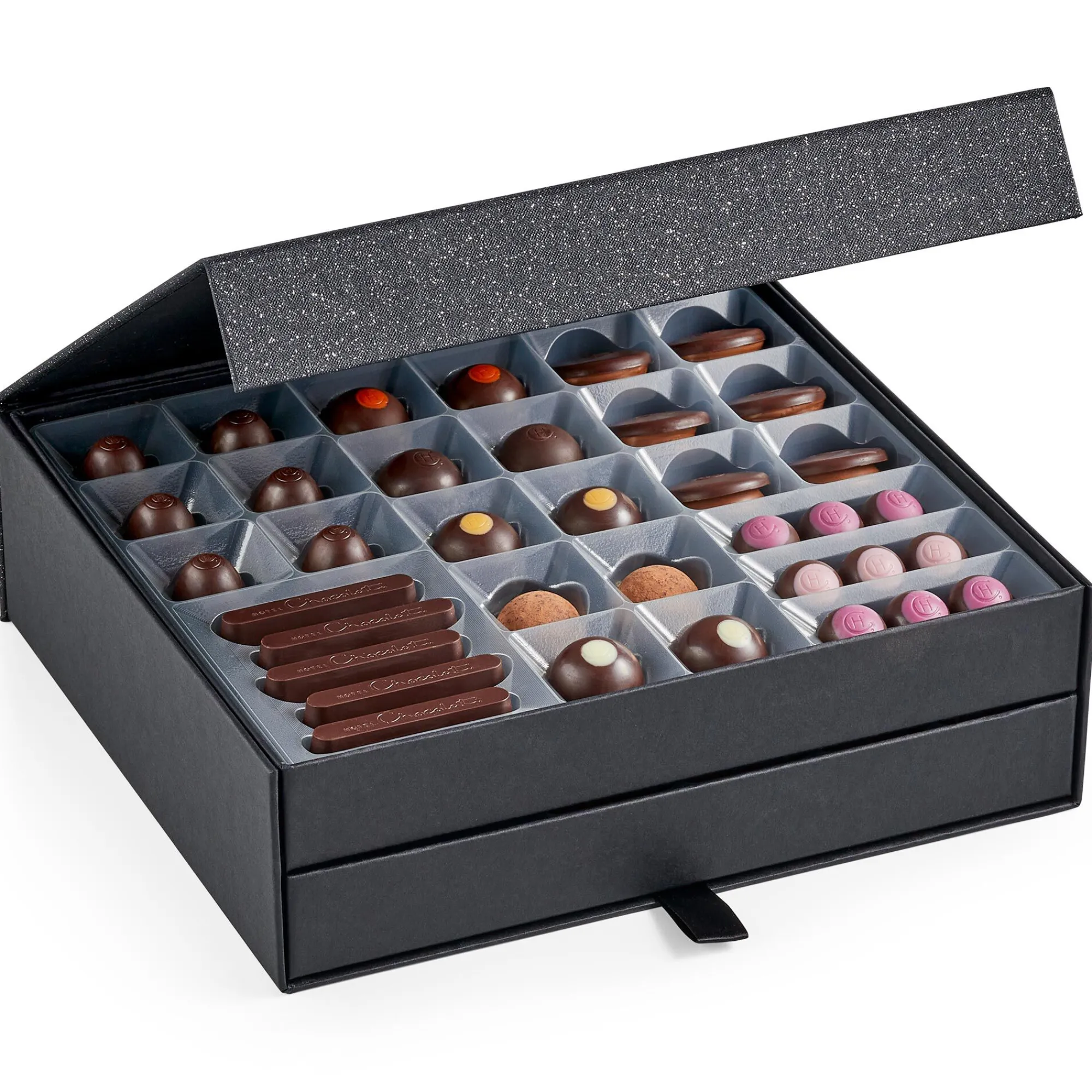 Inside our Inventing Room stands an elegant wooden box with drawers where we keep all our working creations. The Dark Cabinet is modelled after it, and features some of our most celebrated high-cacao recipes. From pralines, caramels and truffles to batons, slabs and macarons, there’s plenty for a dark chocolate devotee to adore. With 59 chocolates presented in a sophisticated two-tier box, it makes a striking gift, too.