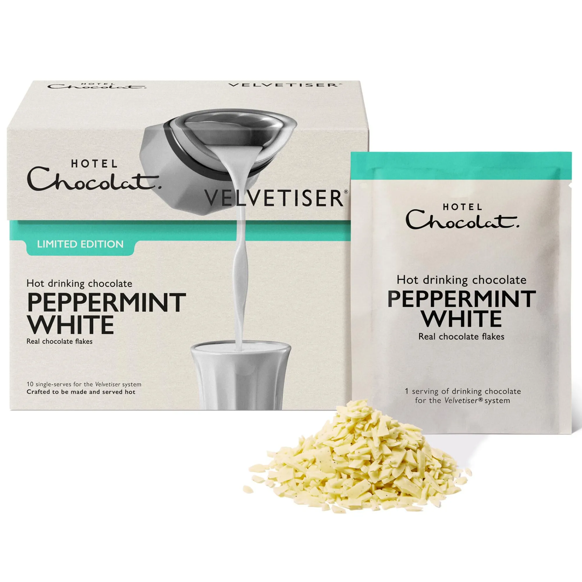 Crafted with real chocolate flakes, and according to our mantra: ‘more cacao, less sugar’, this Peppermint-White hot chocolate is designed to pair with the Velvetiser®* – the complete system for hot and cold barista-grade drinking chocolate.