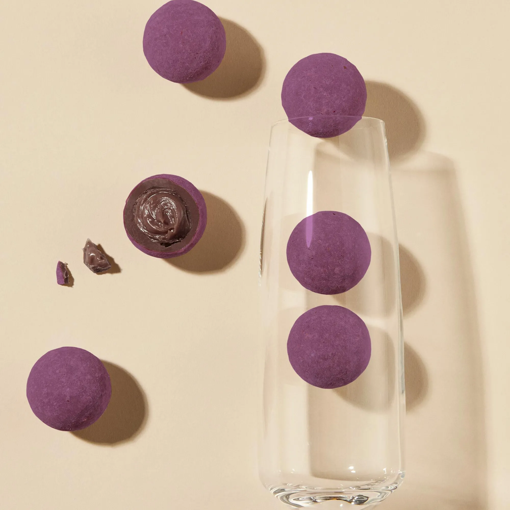 Blackcurrant and cacao make perfect partners, which is why we made these fruity cocktail chocolates with our signature 70% dark. Deep, intense yet unbelievably smooth, we create our house dark with the highest quality cacao, allowing you to taste all the intricate multi-layered flavour notes of the cacao bean. A dark incarnation of our bestselling Champagne Truffles, our Kir Royale truffles are panned to create a vivid purple-hued cacao shell, made – as with all our recipes – with no artificial colours.
