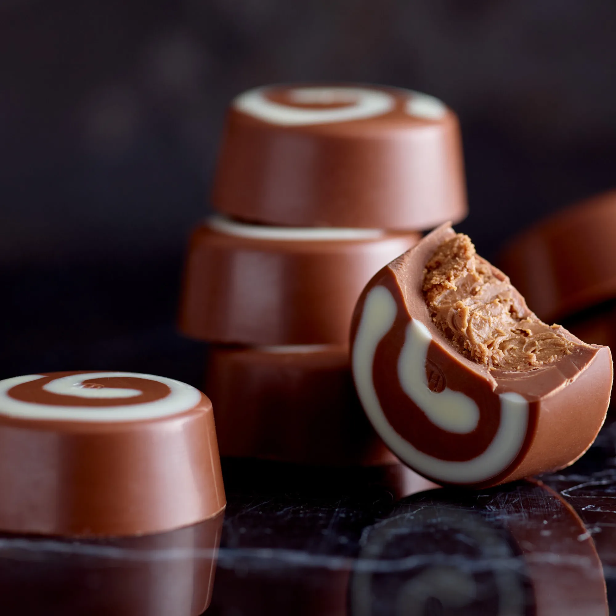 Topped with a white chocolate swirl, our Praline Chocolate Selectors are just as smooth in appearance as they are in texture. If you know of a milk chocolate-lover, why not treat them to our milk chocolate praline selector? Or, if you’re in need of a treat, our pralines are perfect for snacking on in the evening in front of your favourite programme, or on the go if you’re out and find yourself craving some cocoa.