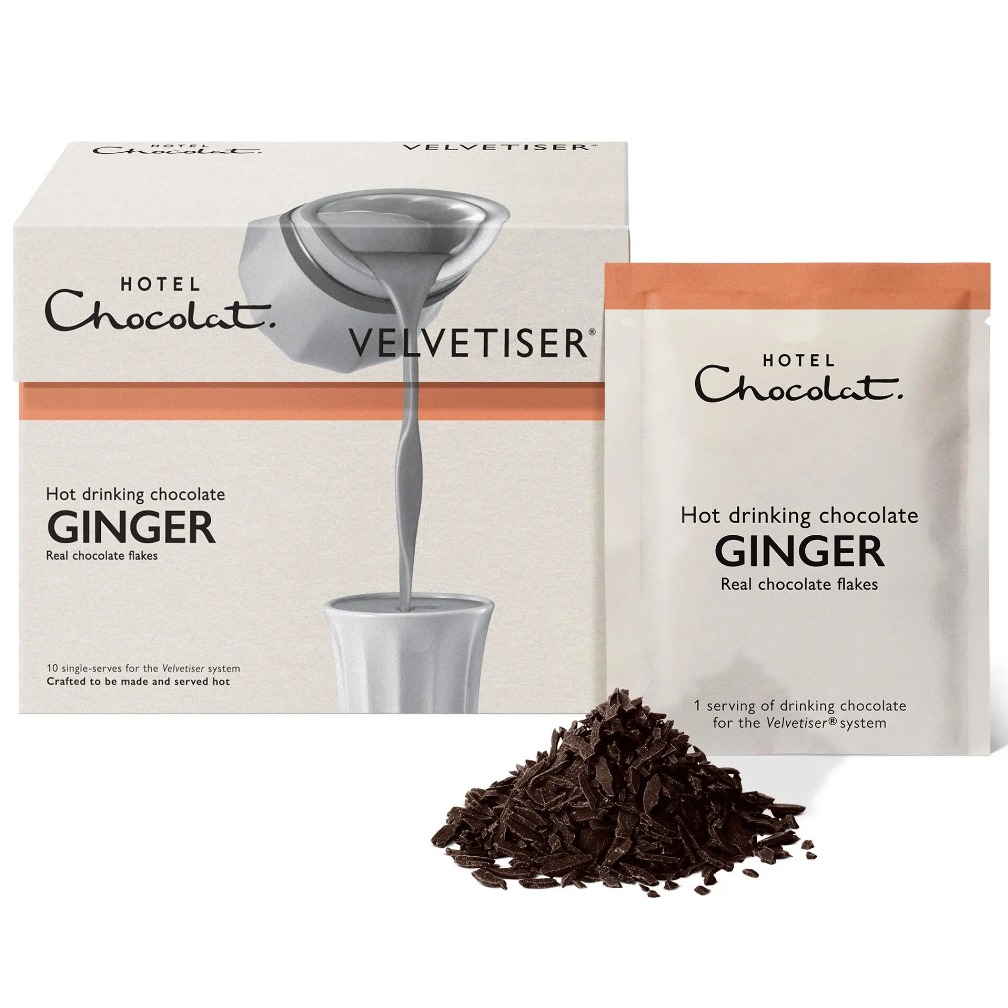 Crafted with real chocolate flakes, each of these 10 Ginger hot chocolate sachets are precisely measured for your Podcup™ and designed to work in harmony with the Velvetiser®* – the complete system for hot and cold barista-grade drinking chocolate. The result is velvet-smooth texture and satisfying cacao depth, with an unrivalled chocolate crema.